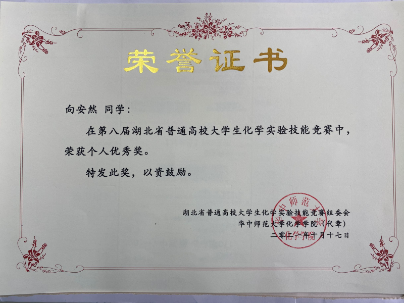 新闻网讯(通讯员姜晓晔 邵哲)10月15-17日,我校医学部制药系6名学生参加第八届湖北省普通高等学校大学生化学实验技能竞赛,并取得较好成绩。2020级应用化学专业学生向安然,2019级药物制剂专业学生徐玉楠、杜潆潆3人荣获个人优秀奖,学校荣获优秀组织奖。