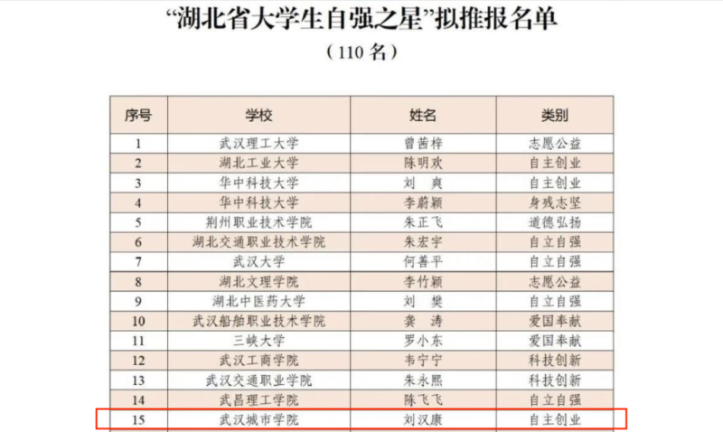 新闻网讯(通讯员 卢诗琪)11月12日,2020年度湖北省“大学生自强之星”名单公示,我校机电工程学部学子刘汉康荣获2020年度湖北省“大学生自强之星”荣誉称号,并同步被推荐至团中央参加“中国大学生自强之星”评选。